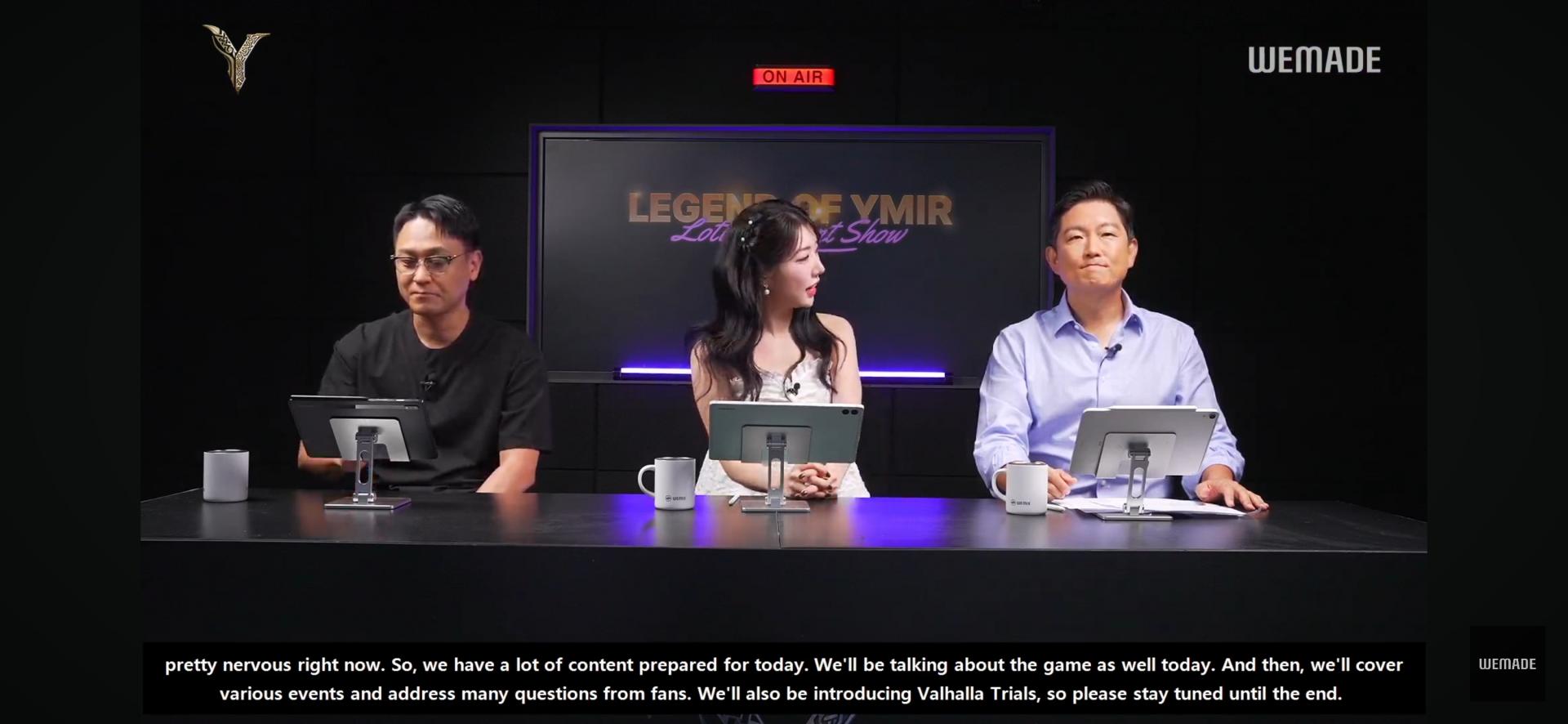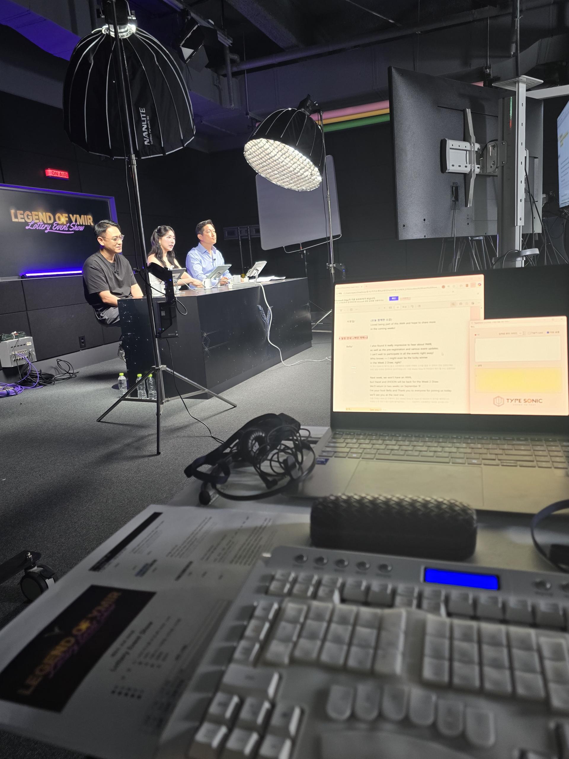 위메이드 본사에서 진행한 Legend of YMIR Lottery Event Show 영문 자막 송출 현장 이미지입니다.